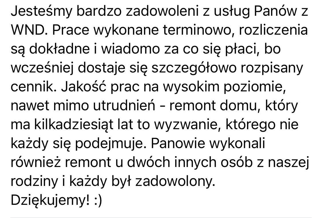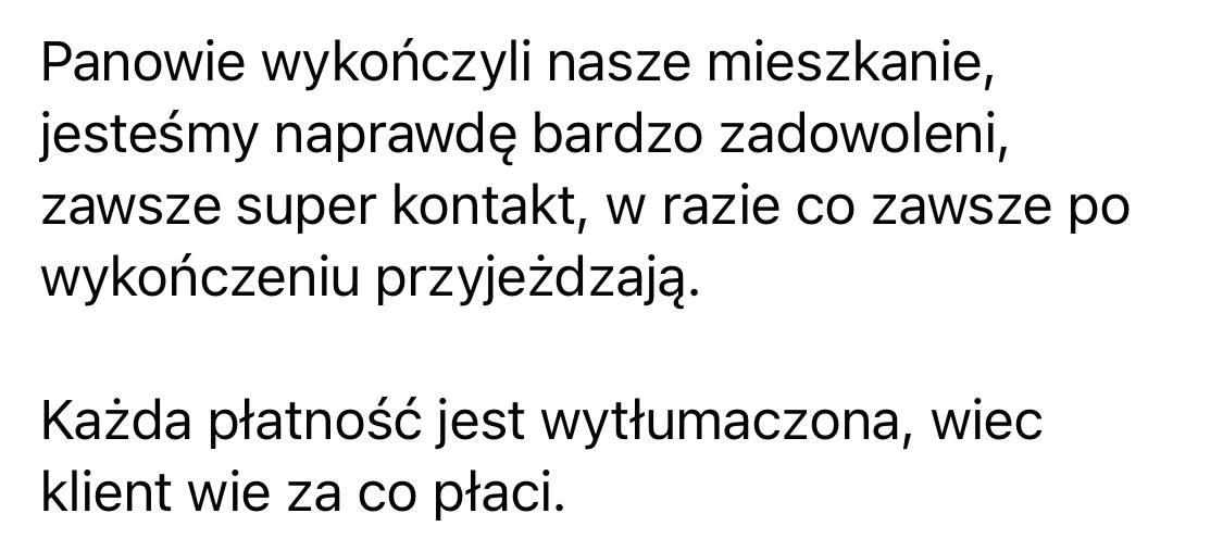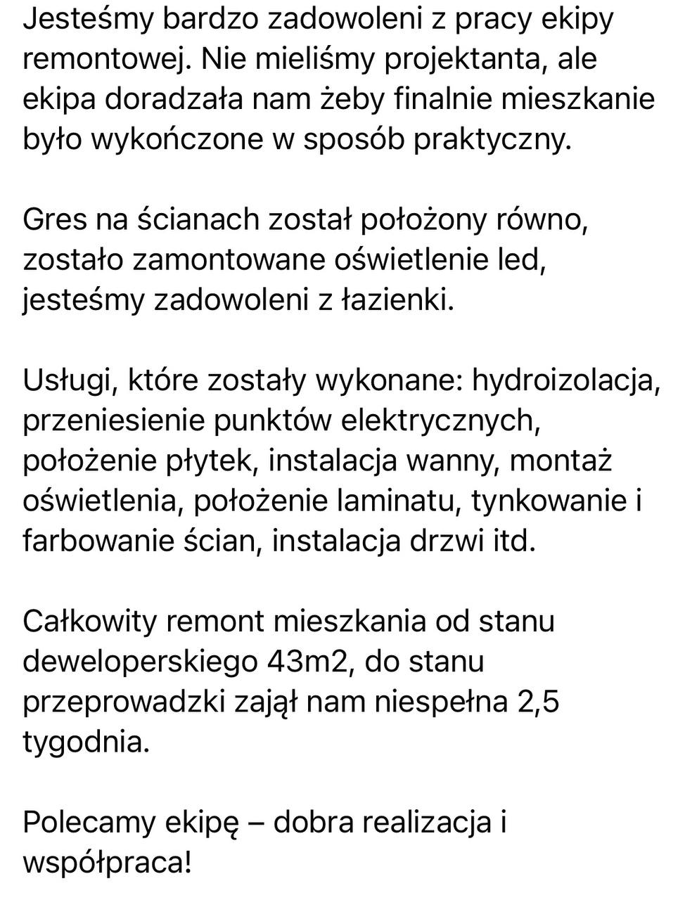 działającą w Warszawie i okolicach. Mamy 10-letnie doświadczenie w Warszawie w branży remontowo-budowlanej. Wykańczamy mieszkania i domy pod klucz. Cały czas rozwijamy się odwiedzając różne szkolenia i nowości w naszej branży. Śledzimy za nowościami narzędzi budowlanych na rynku, a najnowsze rozwiązania wprowadzamy w naszą pracę. Naszym celem jest zadowolony klient.